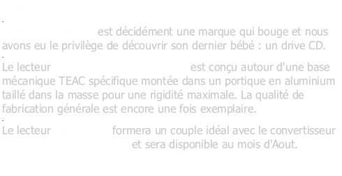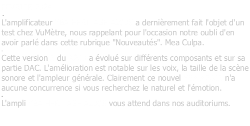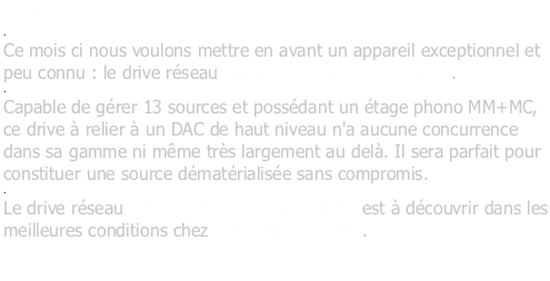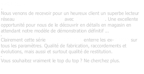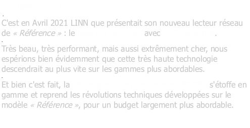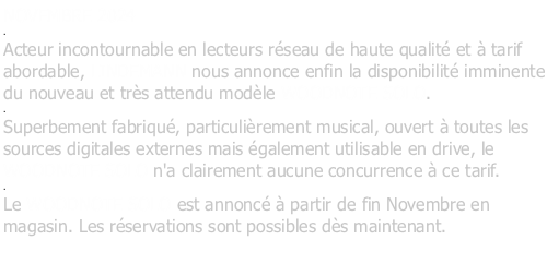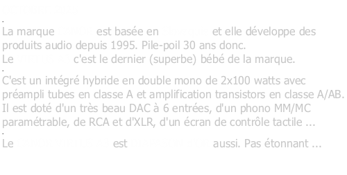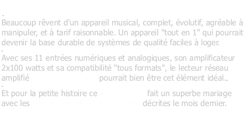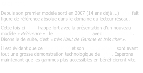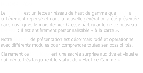 Disponible en silver ou cuivre ou noir, ce petit bloc de verre et d'alu intègre un lecteur réseau + un DAC + un ampli de 2x75 watts.